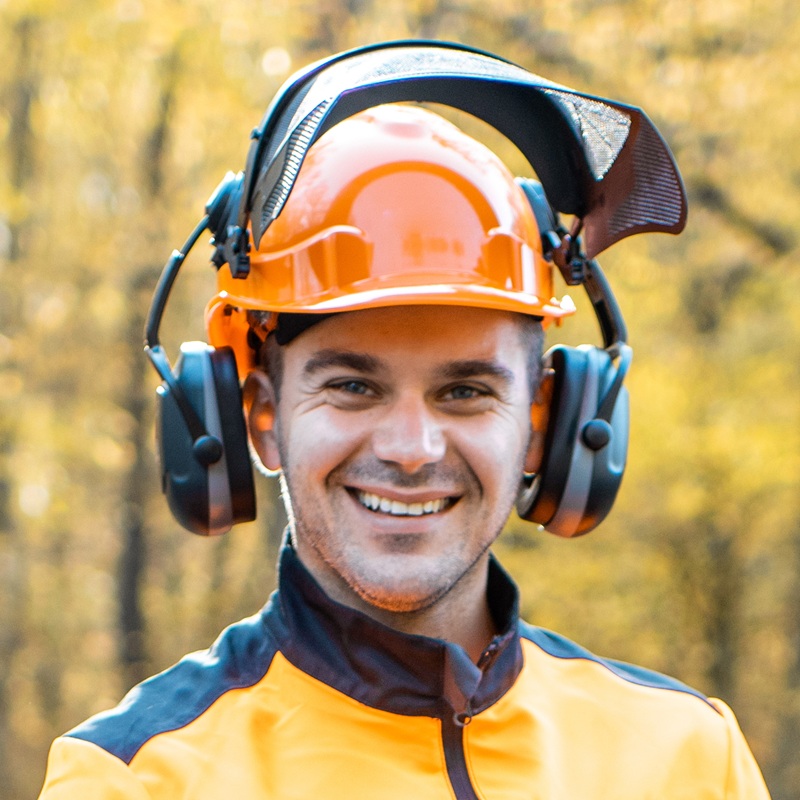 Uses proper PPE (helmets, eye/ear protection, harnesses, gloves)
